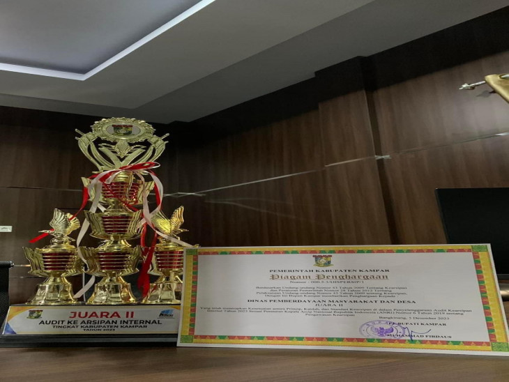 Dinas Pemberdayaan Masyarakat dan Desa Kabupaten Kampar berhasil mendapatkan penghargaan Juara 2 sebagai OPD terbaik dalam Pengolahan Kerarsipan dari Hasil Penilaian Kearsipan Internal tahun 2023. Penghargaan tersebut diberikan saat Launching Aplikasi SRIKANDI (Sistem Informasi Kearsipan Dinamis Terintegrasi) tahun 2023 dirangkaikan dengan pemberian penghargaan untuk seluruh perangkat daerah Kabupaten Kampar yang diselenggarakan oleh Dinas Perpustakaan dan Arsip Kabupaten Kampar bertmepat di Balai Bupati Kampar. Acara tersebut dibuka secara resmi oleh Bapak Pj. Bupati Kampar kemudian sambutan dari Kepala Dinas Perpustakaan dan Kearsipan Kabupaten Kampar turut hadir dalam kesempatan tersebut para Kepala OPD Se- Kabupaten Kampar, Camat dan Kepala Desa.