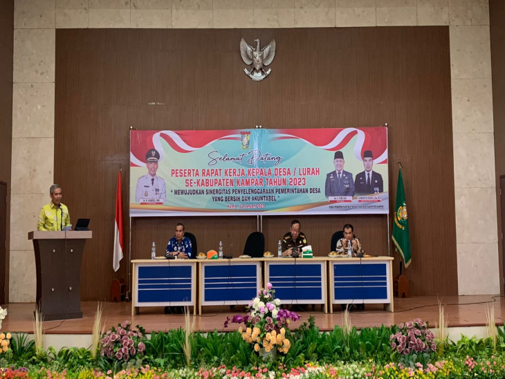 Pemerintah Kabupaten Kampar melalui Dinas Pemberdayaan Masyarakat dan Desa Kabupaten Kampar melaksanakan Rapat Kerja Kepala Desa/Lurah Se-Kabupaten Kampar. Rapat Kerja ini dilaksanakan pada hari Kamis 12 januari 2023 diikuti oleh Seluruh Kepala Desa/Lurah beserta Camat Se-Kabupaten Kampar sebanyak 242 desa. Hadir juga pada kesempatan tersebut Kajati Prov. Riau yang diwakili oleh Asisten Intelijen Kajati Prov.Riau Bapak Raharjo Budi Kisnanto,SH.MH, Kapolres Kampar yang diwakili oleh Wakapolres bapak Rachmad Muchamad Salihi,SIK.MH, Asisten Pemerintahan dan Kesra Ahmad Yuzar, Inspektur Kab.Kampar Febrinaldi Tridarmawan,S.STP.M.Si, Kepala Dinas PMD Kab.Kampar, Lukmansyah Badoe,S.Sos.M.Si dan Kepala OPD lainnya, Camat Se-Kabupaten Kampar, Pimpinan BPJS Kesehatan Kampar, Pimpinan Perbankan di Kabupaten Kampar.
